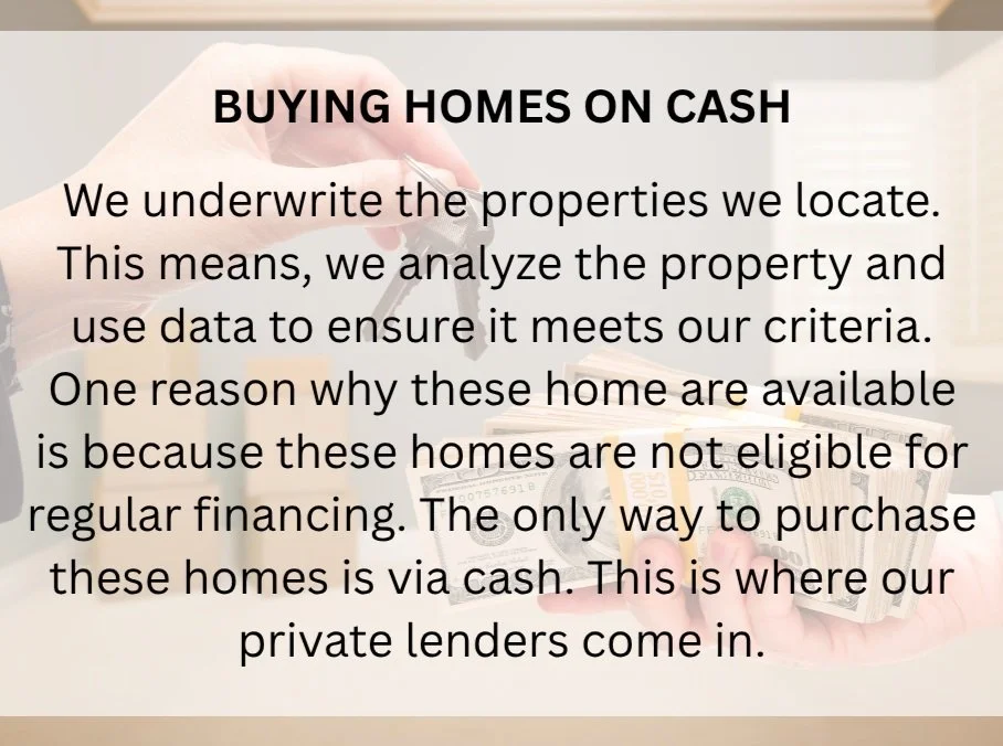 As we put properties under contract, they are shared with our approved list of private lenders. The deal package includes a lot of information that will help you assess the property.